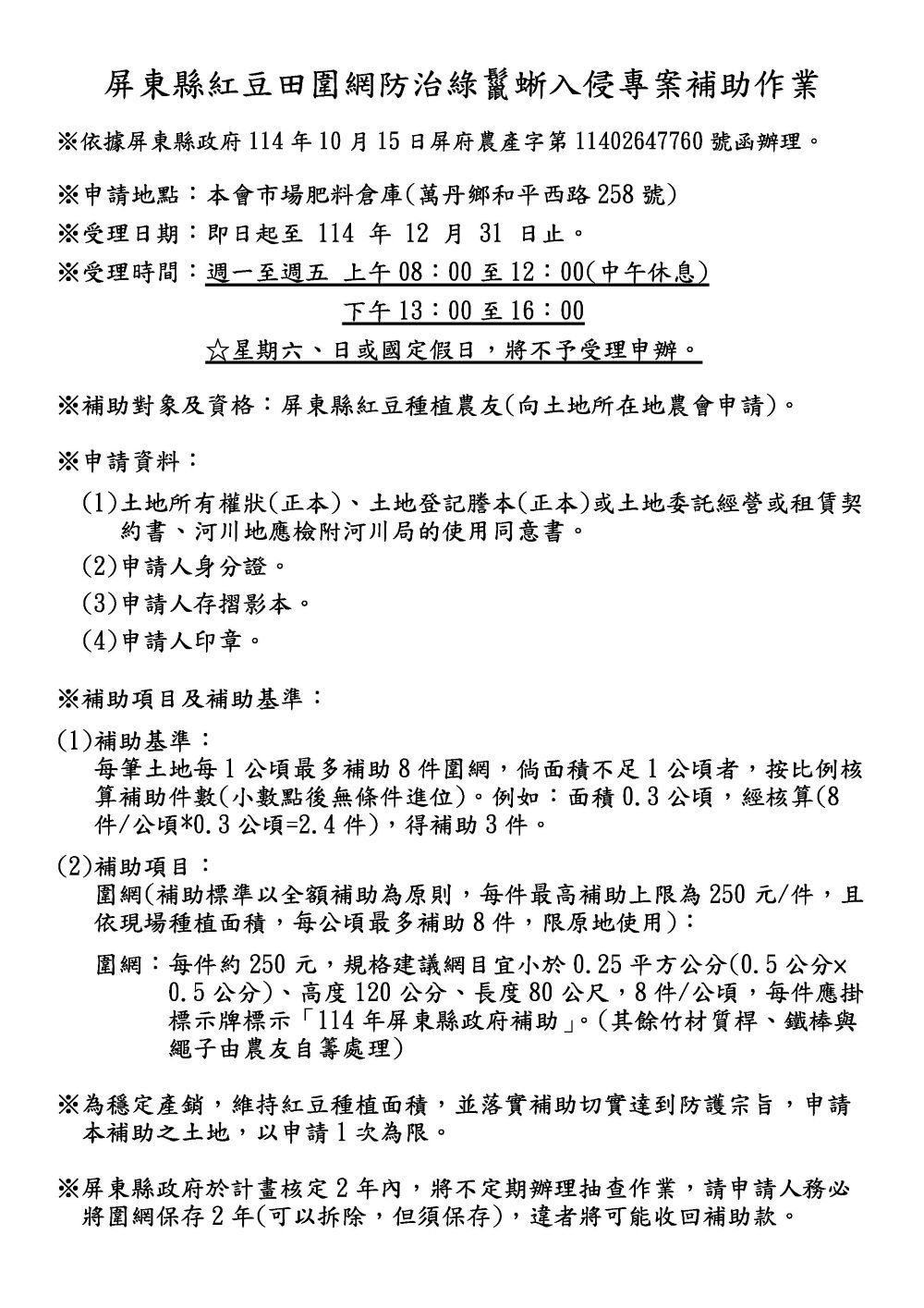 114年屏東縣紅豆田圍網防治綠鬣蜥入侵專案補助作業申請公告