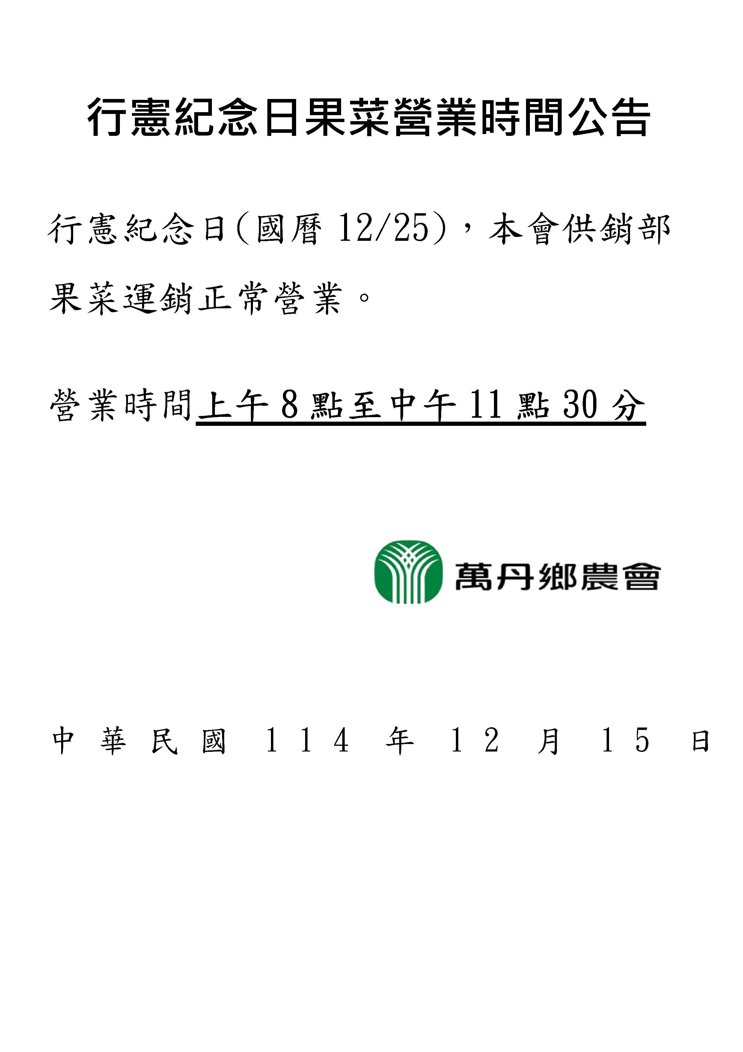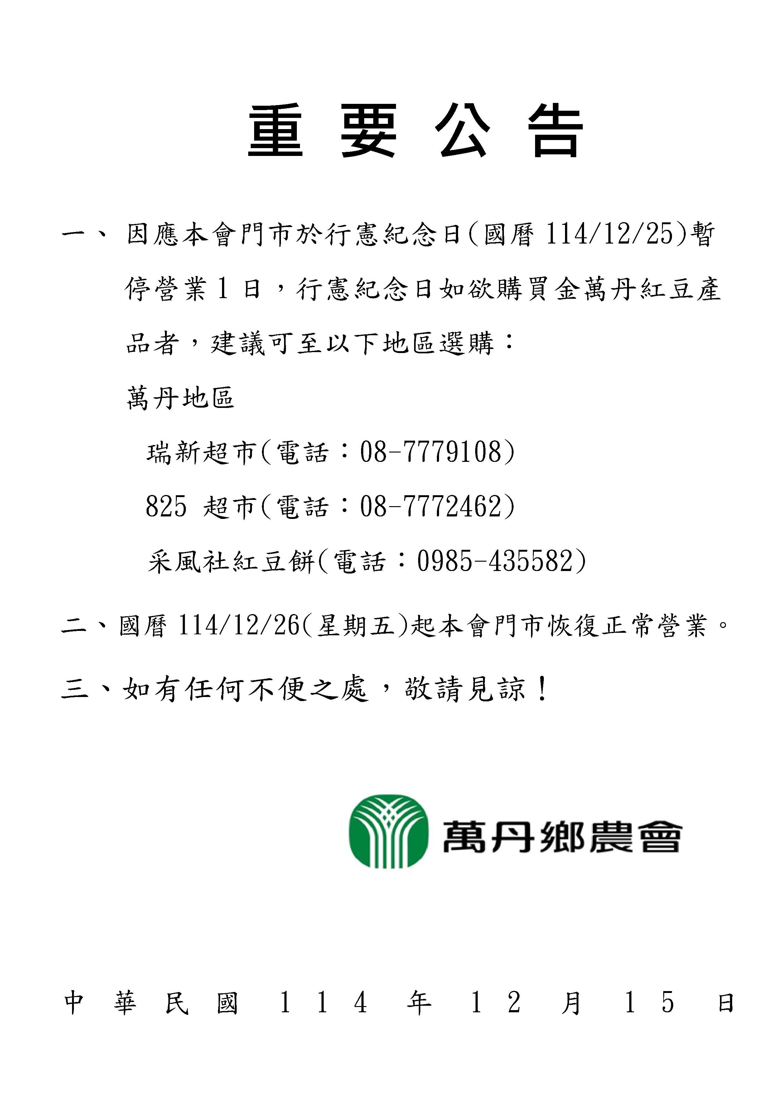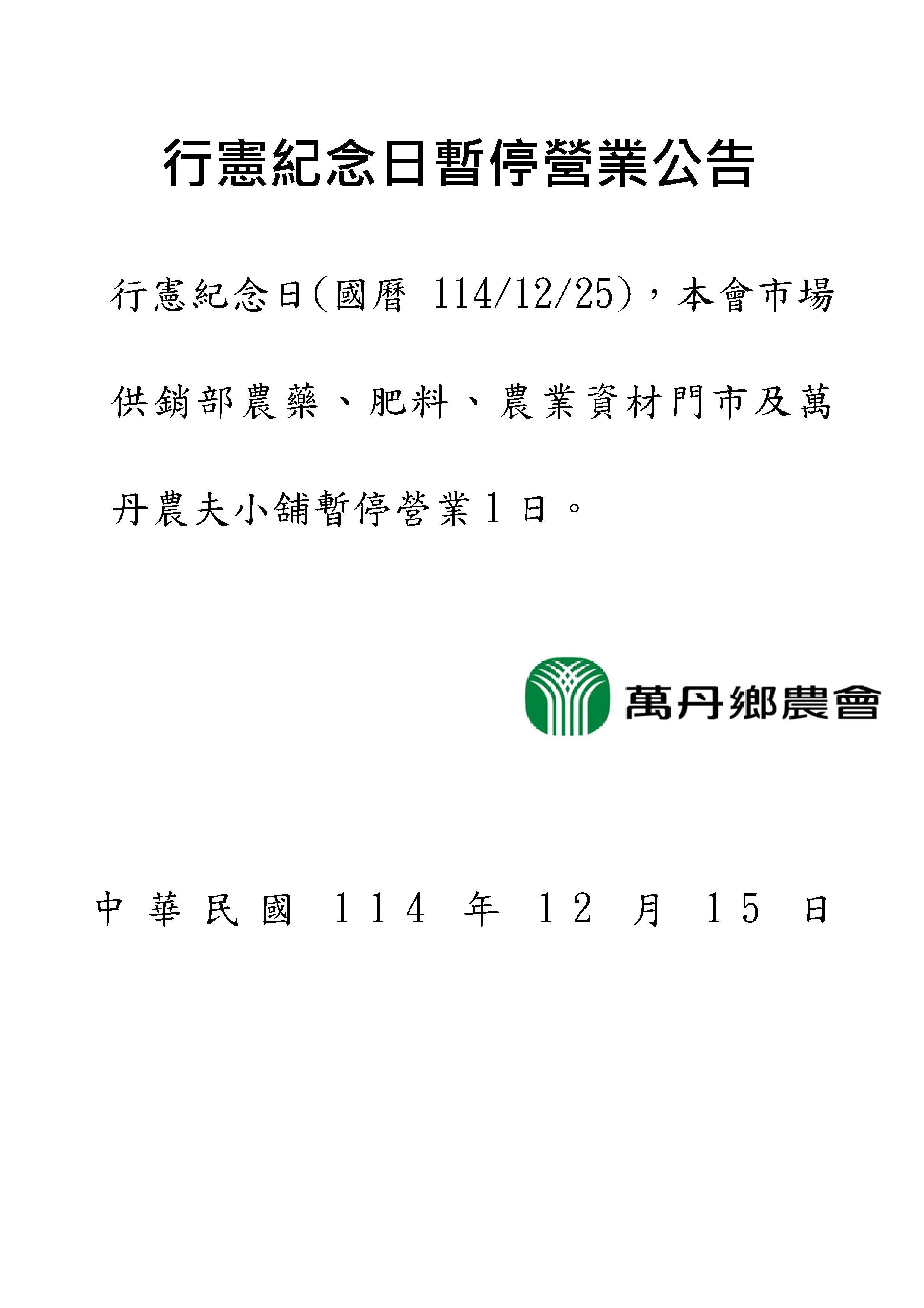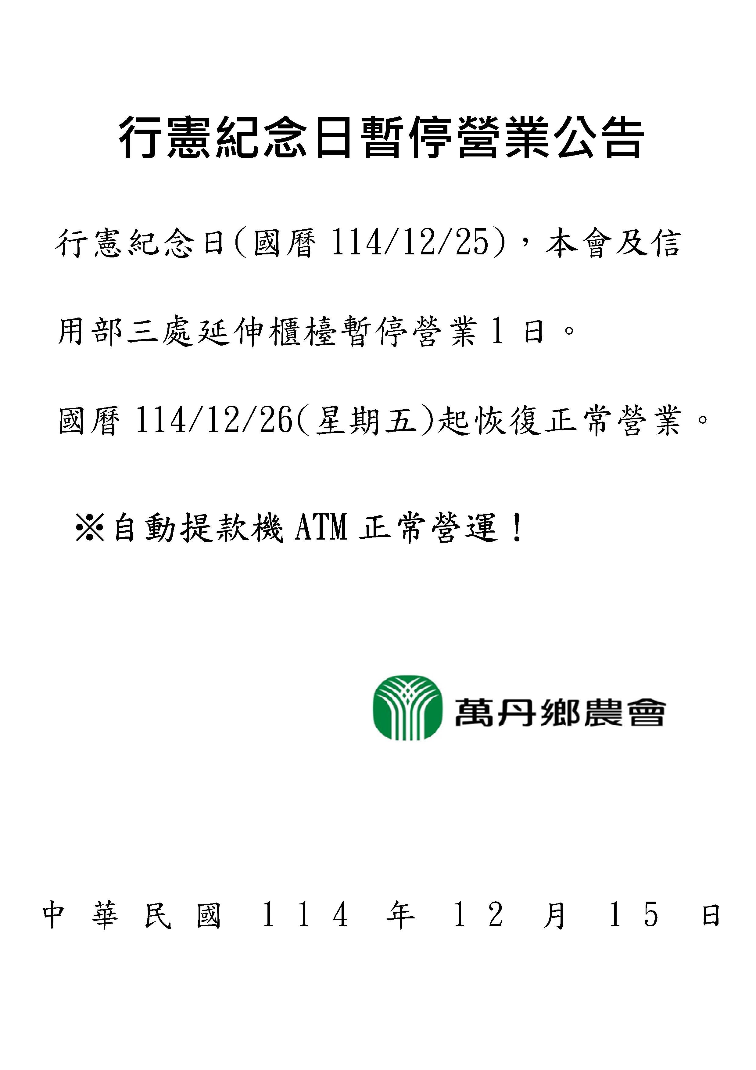 114年12月25日行憲紀念日暫停營業時間公告