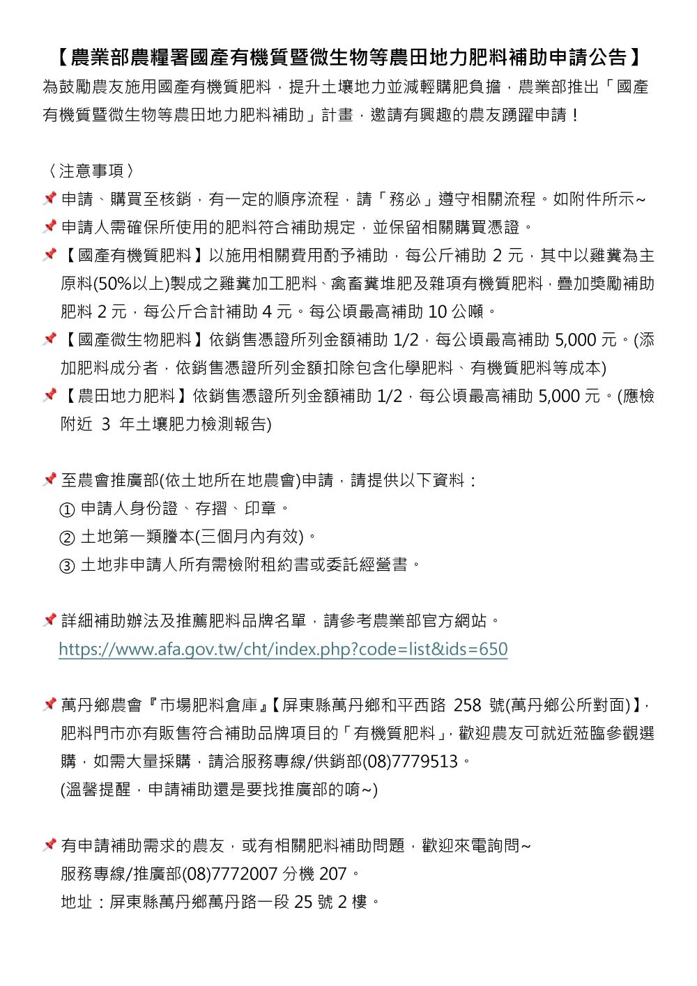 農業部農糧署國產有機質暨微生物等農田地力肥料補助申請公告