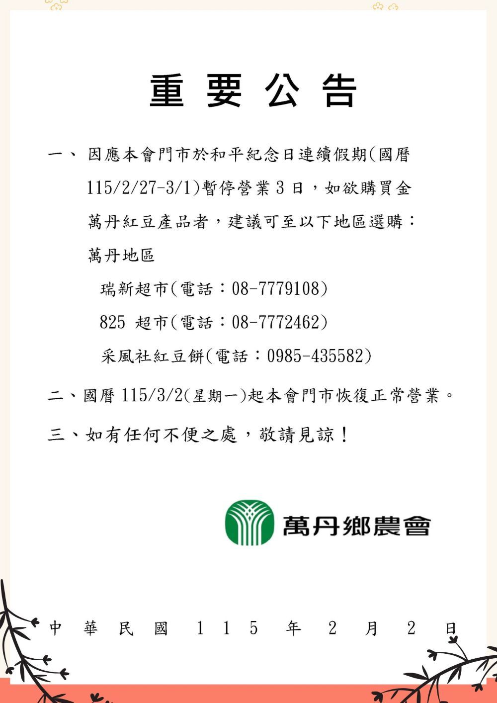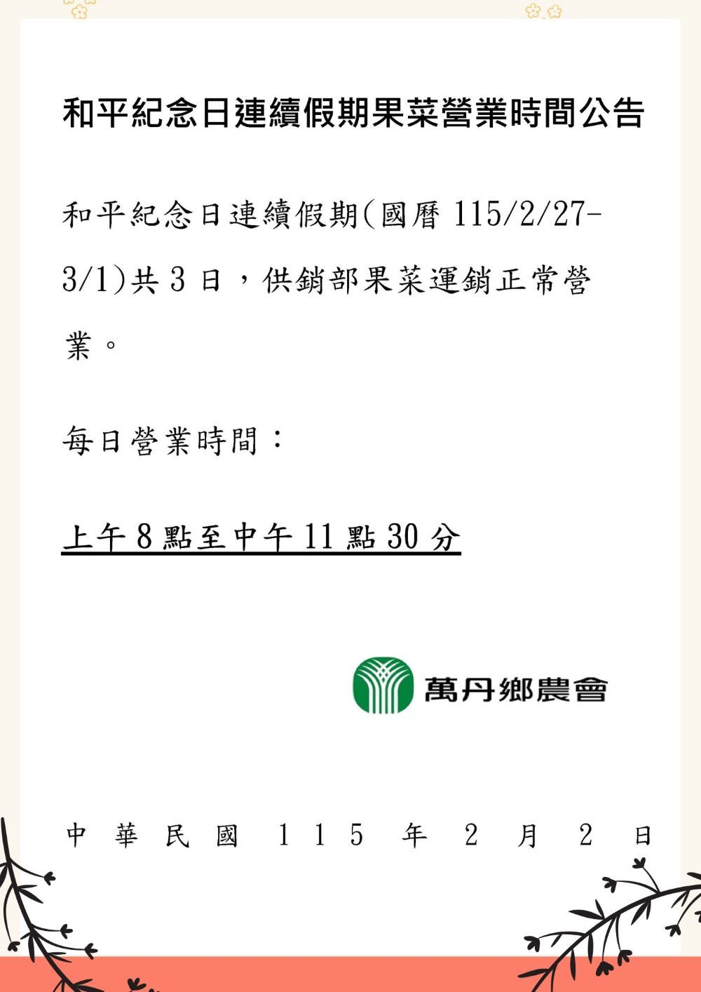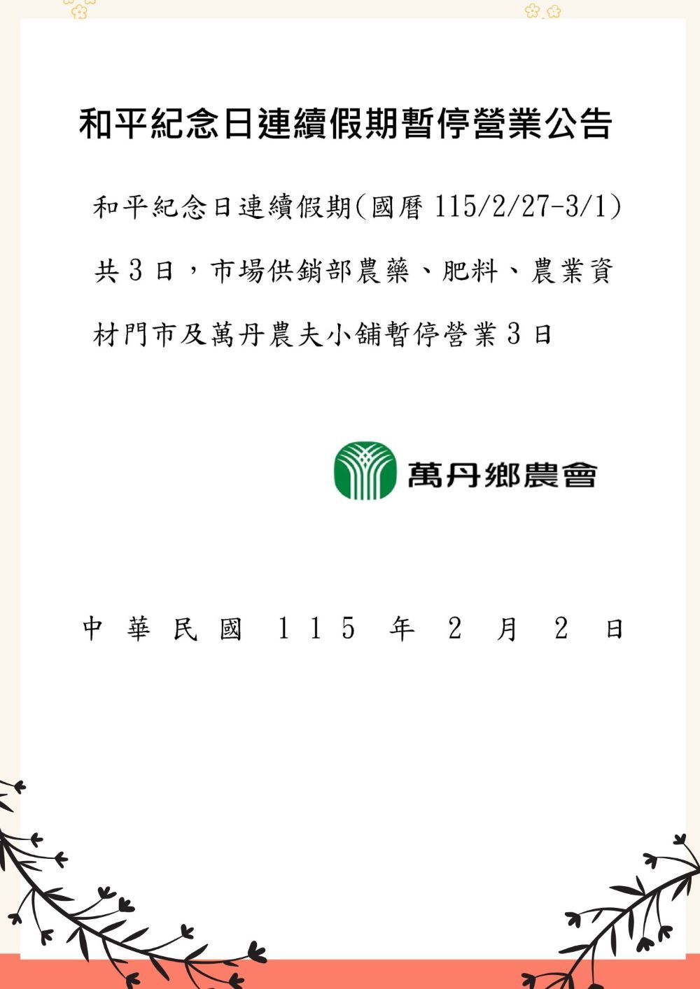 115年和平紀念日連續假期營業時間調整公告