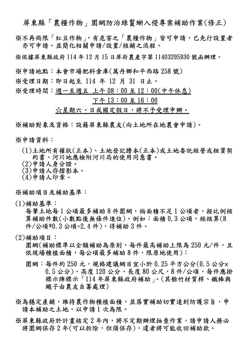 114年屏東縣農糧作物圍網防治綠鬣蜥入侵專案補助作業申請公告(修正)